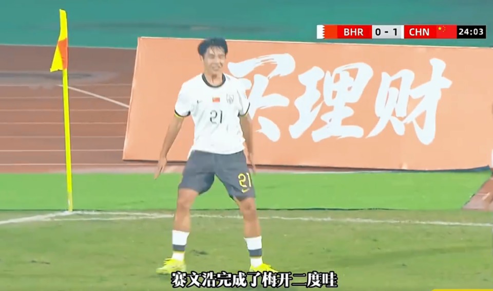 第25分钟,巴林门将易卜拉欣失误,帅惟浩断球捅射击中门柱,球弹回后万项抢到,眼看形成射门,被易卜拉欣绊倒,主裁判判罚点球,万项主罚一蹴而就,3-0!