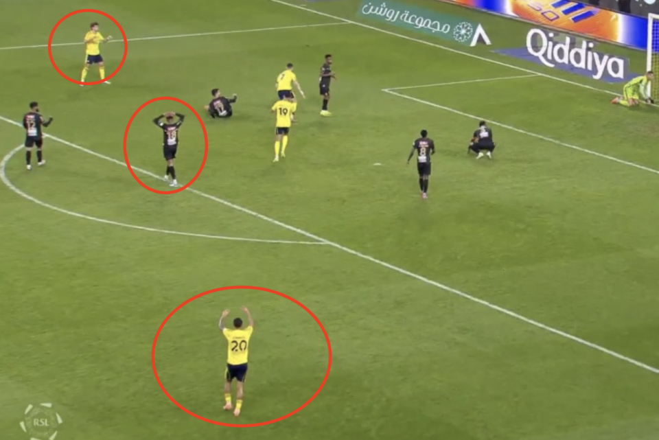 C罗的这脚射门动作舒展,高度惊人,角度刁钻,实在是顶级之作。看台上的利雅得胜利球迷纷纷抱头,不敢相信眼前的一切。