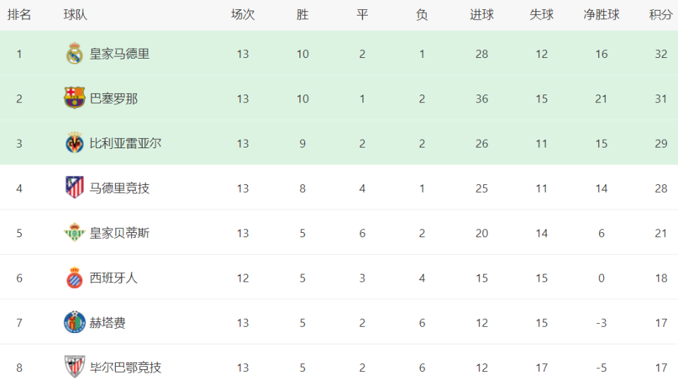 在积分榜上,皇马以32分重登榜首位置。只是皇马的优势很小,只领先身后的巴萨1分。比利亚雷亚尔以29分排名第3。第4的马竞拿到28分。前4差距最多只有4分,冠军的争夺还是很激烈的。第5名的是皇家贝蒂斯,只拿到21分,要想杀入欧冠区有点困难。西班牙人以18分排名第6。