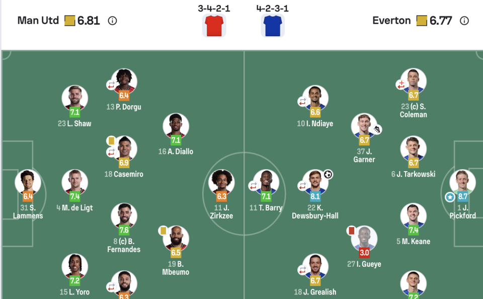 埃弗顿(4231):1-皮克福德;23-科尔曼,6-塔尔科夫斯基,5-迈克尔-基恩,16-米科连科;37-加纳,27-盖耶;10-恩迪亚耶,22-霍尔,18-格拉利什;11-巴里