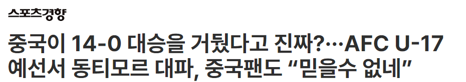 这家韩媒强调称,即便是在亚洲赛场长期处于弱势的中国足球,此次能以14:0大胜,就连中国球迷也感到惊讶。尤其值得一提的是,就在两个月前,中国U22国家队在主场进行的U23亚洲杯预选赛中,仅以2:1险胜东帝汶队,因此此次大胜更让中国球迷大呼过瘾。