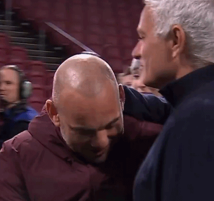虽然多年未见,但穆里尼奥和斯内德依旧亲切。62岁的狂人满脸笑容,与斯内德击掌拥抱。
