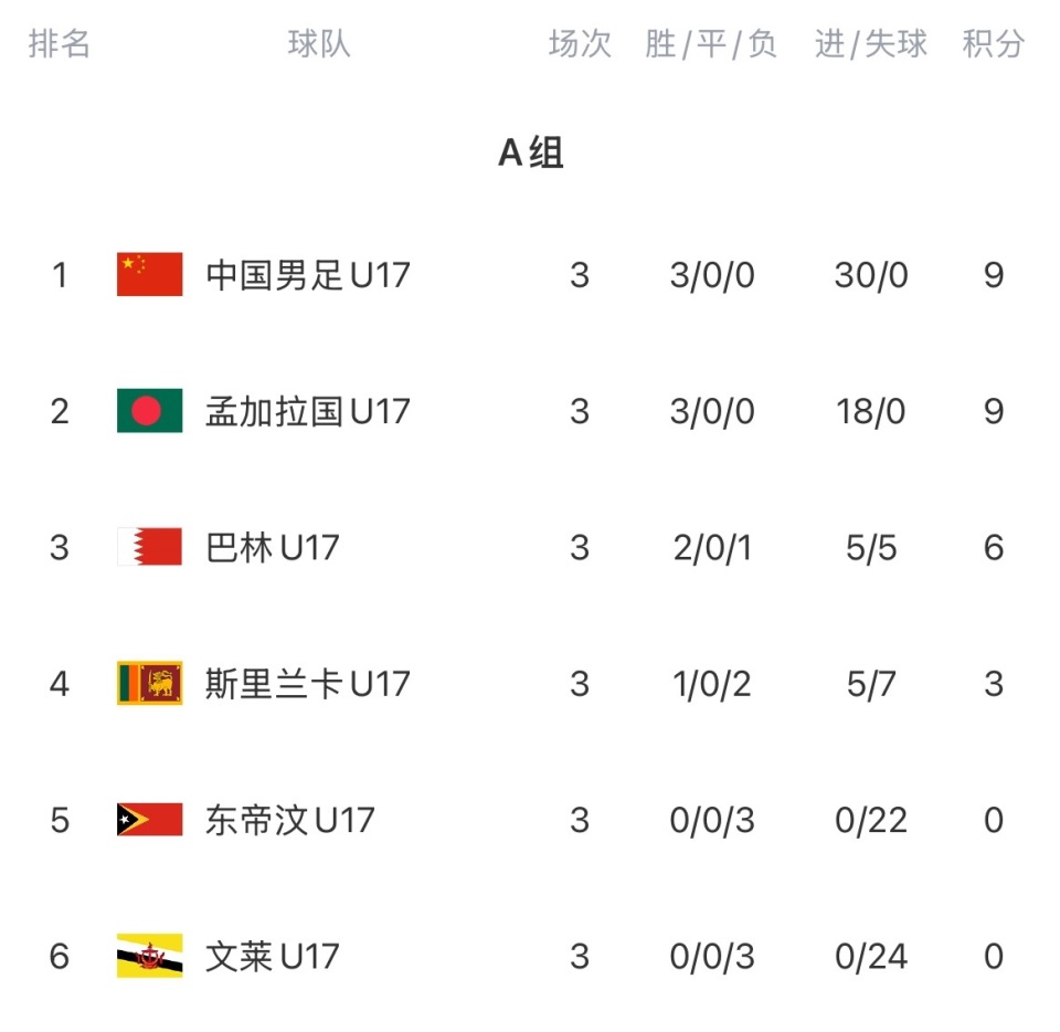 3轮战罢,U17国足与孟加拉国都是3连胜,U17国足打进30球0丢球。而孟加拉国则是打进18球0失球,U17国足领先孟加拉国12个净胜球。