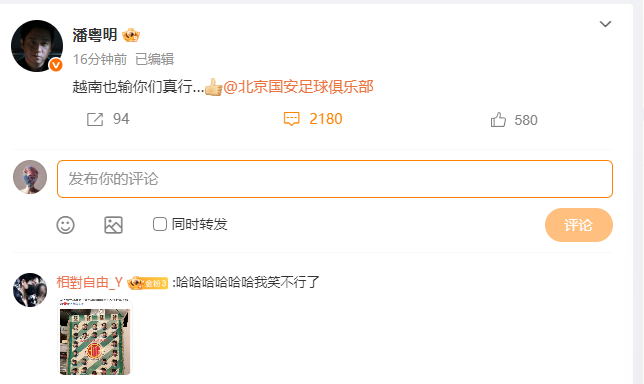 在北京国安出局之后,潘粤明表示,“越南也输你们真行”。同时,潘粤明还@了北京国安俱乐部。