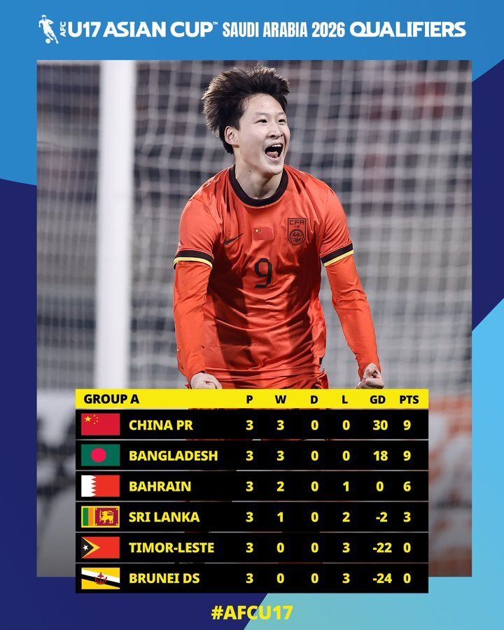 上一场比赛中,中国U17男足12-0大胜文莱队,取得小组赛三连胜。赵松源一人独进六球,张伯霖替补登场完成帽子戏法,全队共有5名不同球员取得进球。