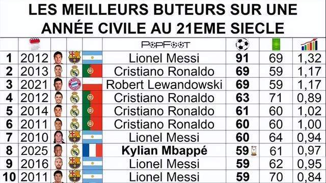 姆巴佩今年已进59球跻身21世纪年度射手榜前十 梅罗占据8席