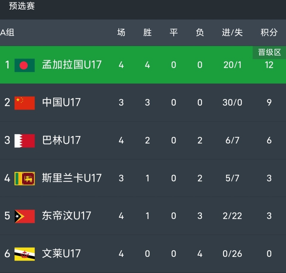 目前A组的积分榜,中国队3战全胜积9分,进30球0失球,净胜球高达30个;孟加拉国4战全胜积12分,进20球丢1球,净胜球19个,暂时登上榜首位置;巴林队2胜2负积6分排名第三,斯里兰卡队1胜2负积3分排名第四。