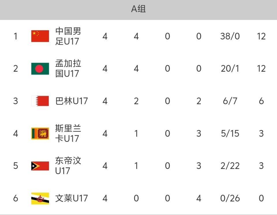 北京时间11月28日,u17亚洲杯预选赛小组赛,中国队8-0击败了斯里兰卡,豪取4连胜,排名小组第一,但是由于同组的孟加拉国击败了巴林,同样是四连胜,所以末轮就是中国队与孟加拉国的生死战了,中国队由于有净胜球的优势,所以我们打平就能出线,而孟加拉国最后一场比赛必须击败中国队才能晋级,以两队的实力来说,中国队赢面还是很大的!
