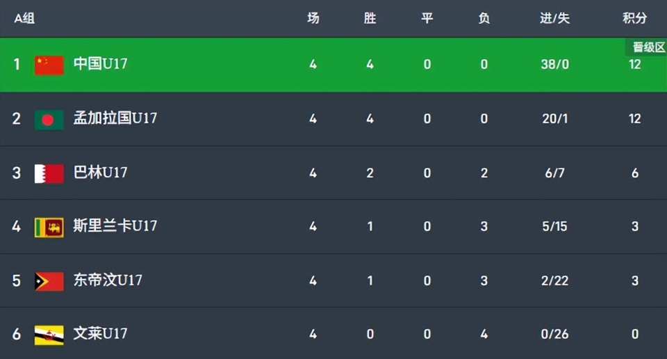 此役取胜后,中国U17男足的积分来到了12分。凭借着净胜球的优势,中国U17男足力压同积分的孟加拉国,继续在A组领跑。