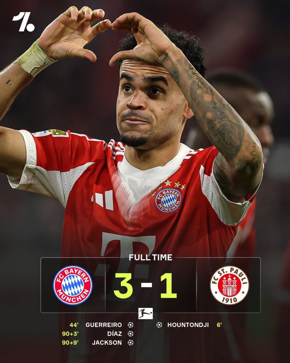 德甲第12轮,拜仁主场3-1逆转圣保利,联赛12轮不败+8分优势领跑。洪通吉首开纪录+伤退,莱默尔后场被断,卡尔和比朔夫中柱,格雷罗扳平比分,迪亚斯倒地助攻,凯恩中柱,迪亚斯和杰克逊补时连入2球反超。