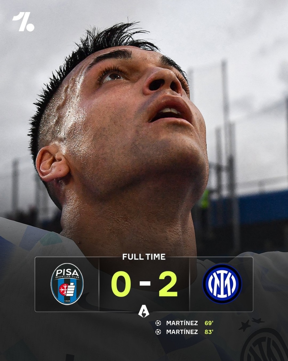 意甲第13轮,国米客场2-0击败比萨,落后榜首AC米兰1分。迪马尔科任意球造险,劳塔罗梅开二度,埃斯波西托和巴雷拉分别助攻。