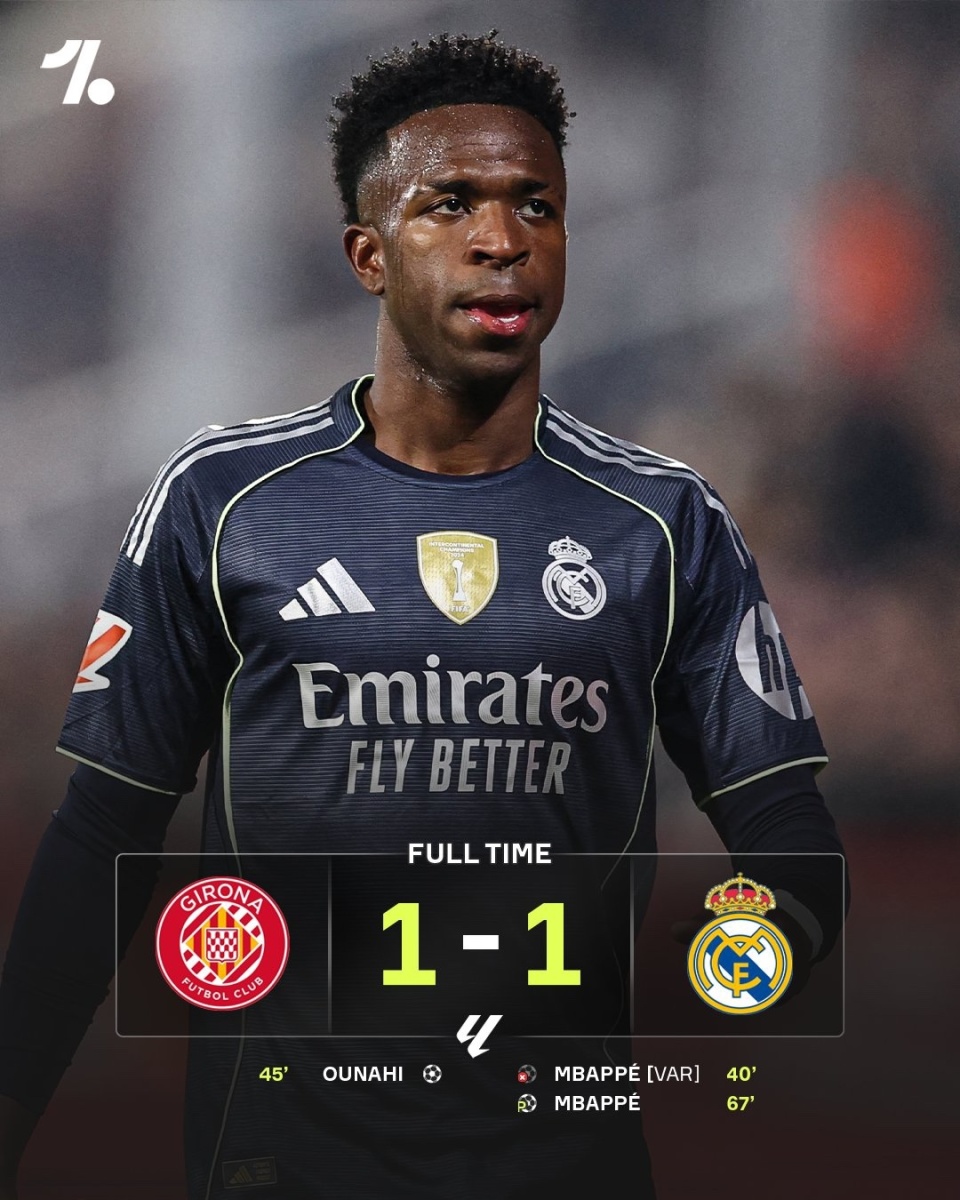西甲第14轮,皇马客场1-1战平赫罗纳,连续三轮联赛都取得平局,落后榜首巴萨1分。姆巴佩打进一球,但是被判罚越位在先,奥纳西破门首开纪录,姆巴佩点射扳平但错失绝杀。