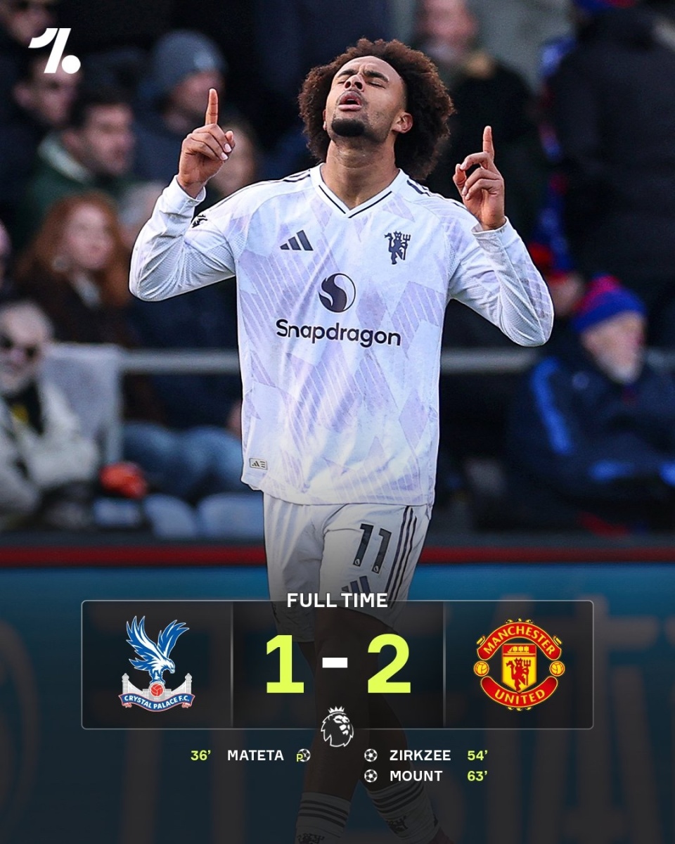 曼联客场2-1逆转水晶宫,终结英超3轮不胜。约罗送点,马特塔主罚点球破门,但被吹二次触球无效,重罚依然命中,B费任意球助攻,齐尔克泽0度角抽射破门,B费任意球再一拨,芒特远射破门反超。