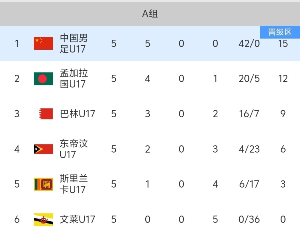 北京时间11月30日,u17亚洲杯预选赛小组赛第5轮比赛,中国队4-0大胜孟加拉国,以五战全胜的战绩小组第一出线!这次中国队表现的非常出色和稳定,我们5场比赛总共打进了42球,而且一球未失,比赛中涌现出了很多优秀的年轻球员,帅惟浩、邝兆雷、赵松源、张博霖、万项等等,这些球员非常需要世界大赛的洗礼,接下来我们就要踢亚洲杯的正赛了,亚洲前8可以踢u17世界杯,希望这次中国队能够打进世界杯,我们的年轻人太需要好的舞台了!