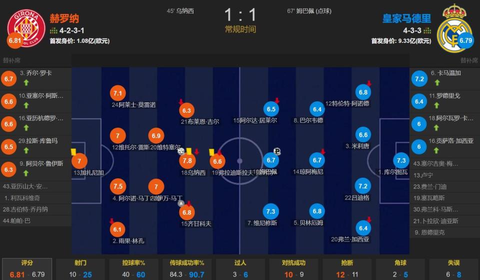 上半场,姆巴佩破门因越位在先被吹掉,随后奥纳西打破场上僵局,皇马半场0-1落后;下半场,维尼修斯造点,姆巴佩点射扳平比分。