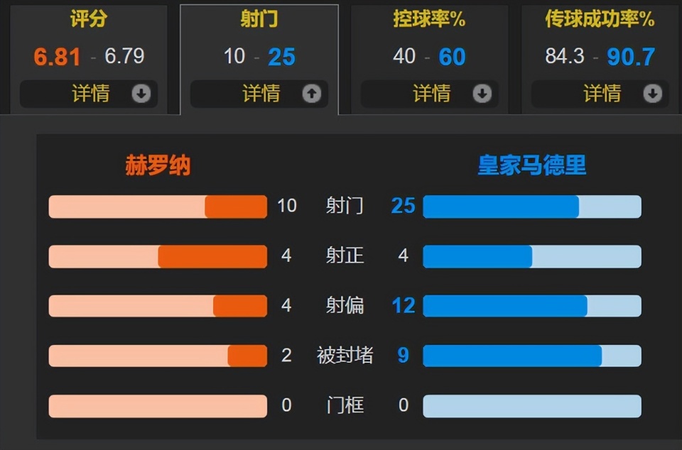全场比赛,皇马的控球率为六成,狂射25脚,比赫罗纳足足多了10次射门,但双方都是4次射正。用一句话来概括目前的皇马,那就是“帅无能累死三军”。
