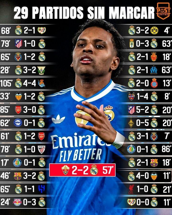 又一次两手空空后,罗德里戈已经连续30场比赛无法为皇马破门,这追平了皇马队史上123年的前锋进球荒纪录。此前,马里亚诺也曾连续30场比赛无法破门。