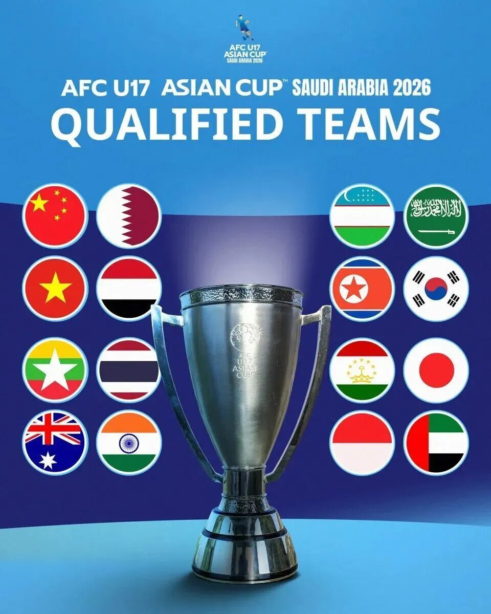 至此2026年U17亚洲杯的16支参赛队正式出炉。除了这7支从预选赛突围的球队之外,日本、朝鲜、韩国、沙特、乌兹别克斯坦、阿联酋、塔吉克斯坦、卡塔尔和印尼则直接入围!