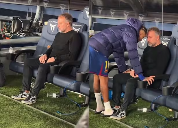 比赛结束后,他坐在替补席上,镜头对着他的侧脸,少见的疲惫,甚至有几分空洞。29 岁的拉菲尼亚走过来和他说话,他只是摇头,甚至有种“明明赢球却像输了”的感觉。
