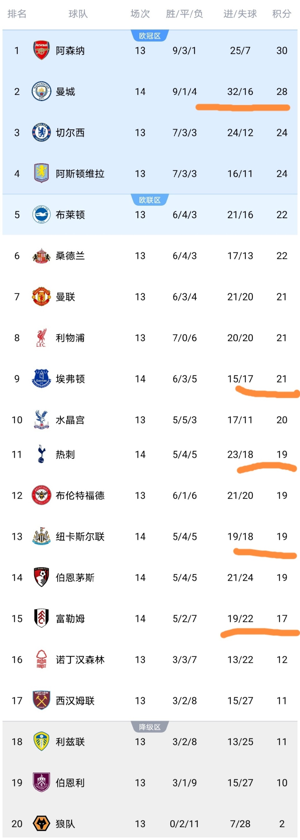 可以看到曼城排名第2,但是仅落后阿森纳2分,曼城逼近榜首了,此外埃弗顿排名第9,积分跟曼联、利物浦相同,热刺、纽卡都是19分,热刺第11,纽卡第13,富勒姆17分排名第15。
