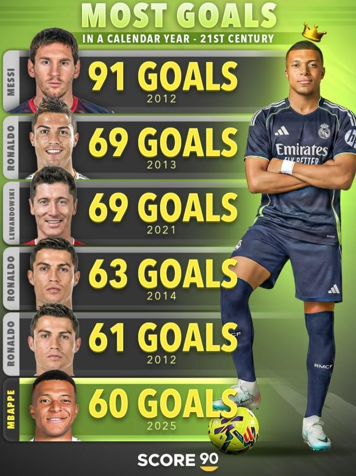 一直以来,年度进球总数是衡量前锋在单一年份锋线统治力的重要标准。而作为今年截止到目前进球最多的球员,皇马前锋姆巴佩已经在2025年打入了60粒进球。这在21世纪所有的球星当中,可以排在并列第六的位置。能够和姆巴佩同时排在第六的,分别是2011年的C罗以及2010年的阿根廷球王梅西。