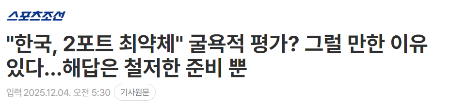 这家韩媒表示,欧洲和南美媒体的看法如出一辙,韩国队是第二档球队最弱的代表。英国体育媒体DAZN在近期发布的英格兰队世界杯抽签“最佳-最差”分组预测中,将与韩国队同组列为最佳签运。该媒体分析称:“第二档球队包括韩国、日本、伊朗、澳大利亚。对于英格兰队而言,与亚洲球队同组,堪称抽到了第二档里的上上签。”阿根廷媒体TyC体育也在世界杯参赛球队实力分析中,将韩国队列为第二档最弱球队。
