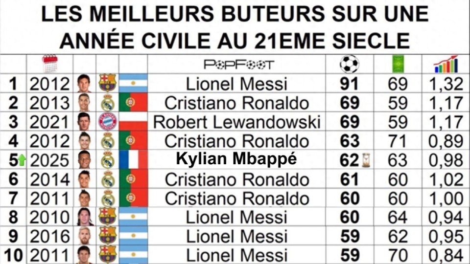 据数据统计,姆巴佩62球让自己在21世纪自然年进球榜上已经爬升至第五。姆巴佩今年还剩下4场比赛,分别是主战塞尔塔、主战曼城、客战阿拉维斯和主战塞维利亚。姆巴佩在未来4场比赛中若能入7+进球,就能冲击由莱万(2021年)和C罗(2013年)共同保持的自然年69球的纪录。
