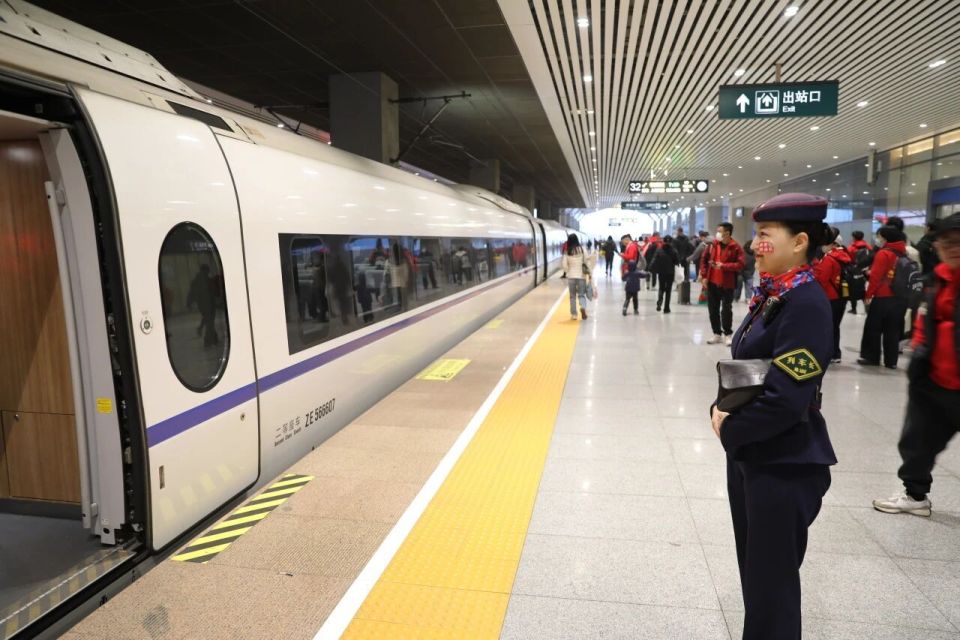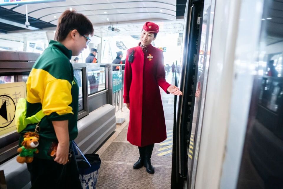 G1801次列车旅客常女士:“以前都是自驾去看球,现在孩子大了,乘坐高铁更方便一些。很开心能坐上这趟‘球迷专列’,不仅氛围好、服务好,车厢内还干净整洁。孩子特别开心,说下次还想坐这趟高铁。”