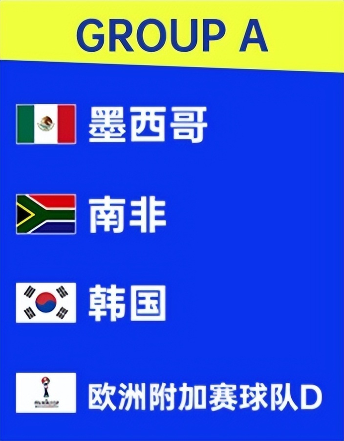 A组包括墨西哥、南非、韩国、欧预赛附加赛D选手(丹麦VS北马其顿、捷克VS爱尔兰的胜者)。对比来看这应当是本届大赛最弱的一组了,几支队伍的能力相对平均,没有特别拔尖的、也没有特别弱的。因此,在出线方面概率几乎均等,只有墨西哥略强一点点。
