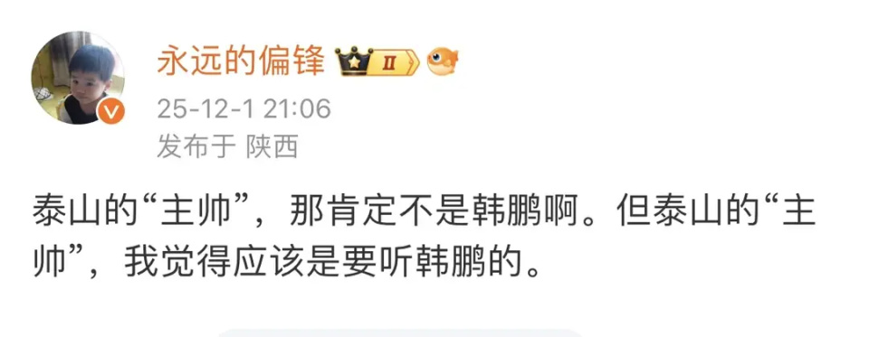 而就在近日,媒体人陈永的一番话无疑是引发了球迷的格外关注,陈永透露出了泰山队主帅的计划安排。称明年韩鹏肯定不会是泰山队主帅,但是他大概率会继续执掌球队,只是受限于教练证级别,他无法以正式主教练身份指挥比赛。不过,这并非难题,找个有证者担任名义主帅,但还是要听韩鹏的,从这点来看球队对韩鹏的信任可见一斑,而且球队也是希望换个活法。