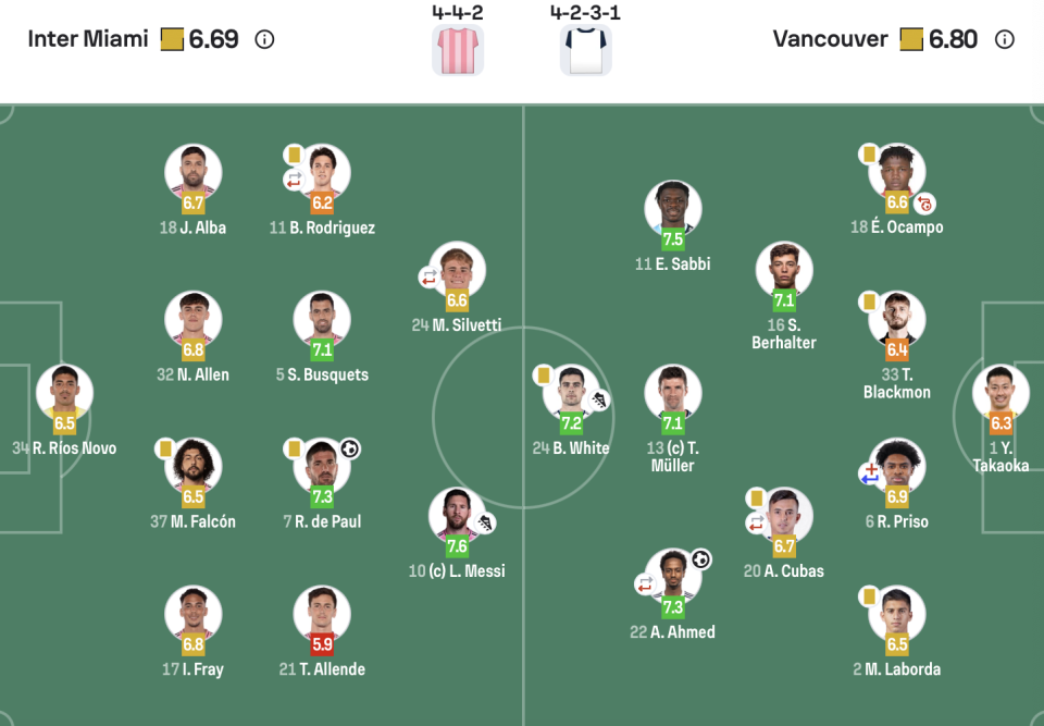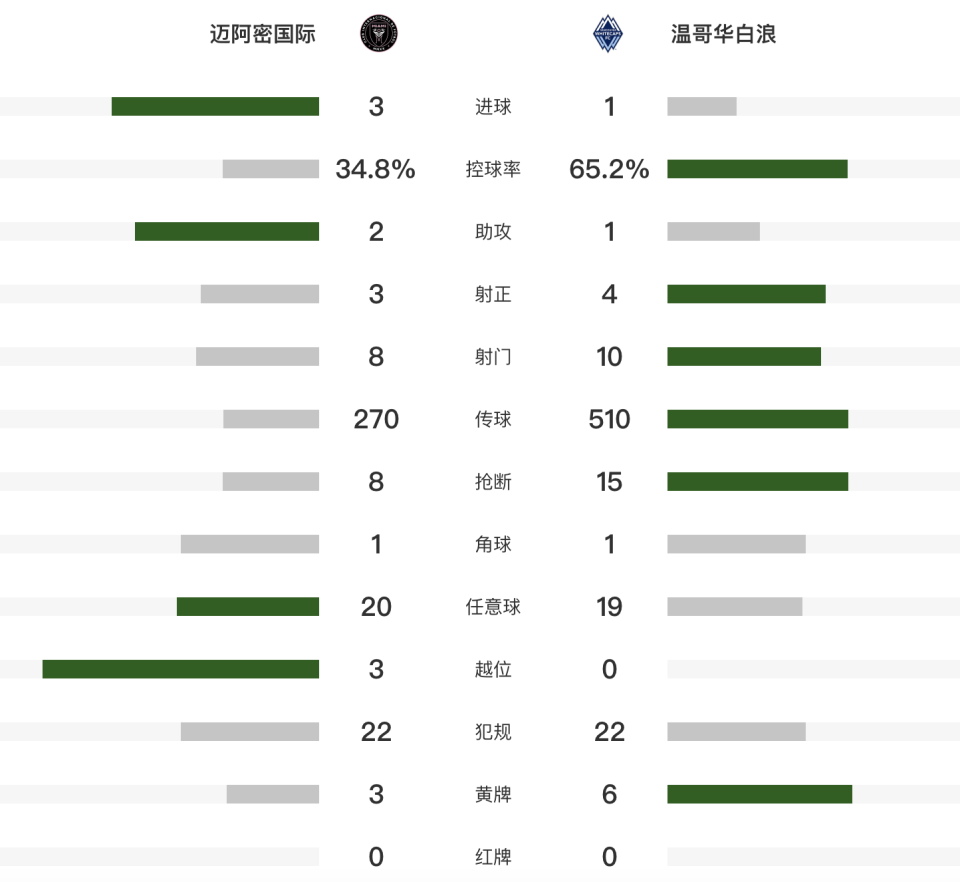 迈阿密国际(442):34-里奥斯;17-弗莱雷,37-法尔孔,32-阿伦,18-阿尔巴;11-罗德里格斯(56’8-塞戈维亚),5-布斯克茨,7-德保罗,21-阿连德;10-梅西,24-希尔维蒂(78’42-布莱特)