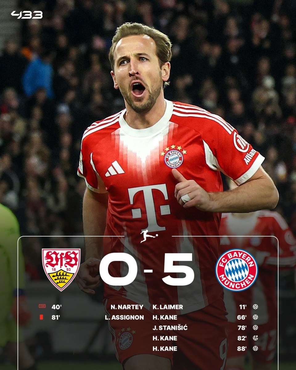 德甲第13轮,拜仁客场5-0斯图加特,12胜1平积37分继续领跑。奥利塞助攻莱默尔脚后跟破门,凯恩上演帽子戏法,斯坦尼西奇进球,阿西格农送红点。