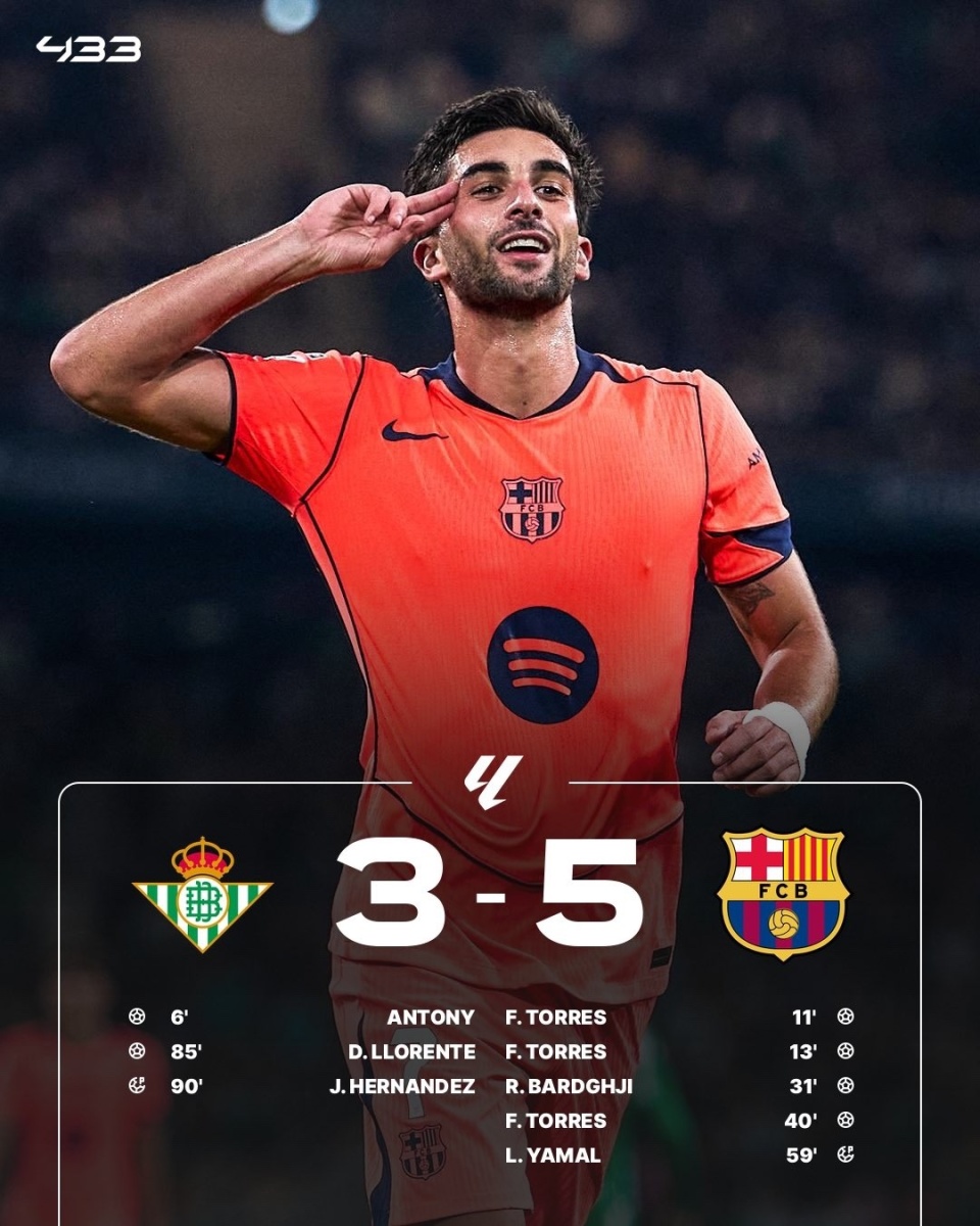 西甲第15轮,巴萨客场5-3击败贝蒂斯,西甲取得6连胜,先赛4分领跑!安东尼破门,费兰2分钟2球反超,佩德里助攻巴德吉再下一城,费兰远射破门完成帽子戏法,拉什福德造点,亚马尔点射破门,略伦特扳回一城,补时阶段孔德送点,库乔点射。