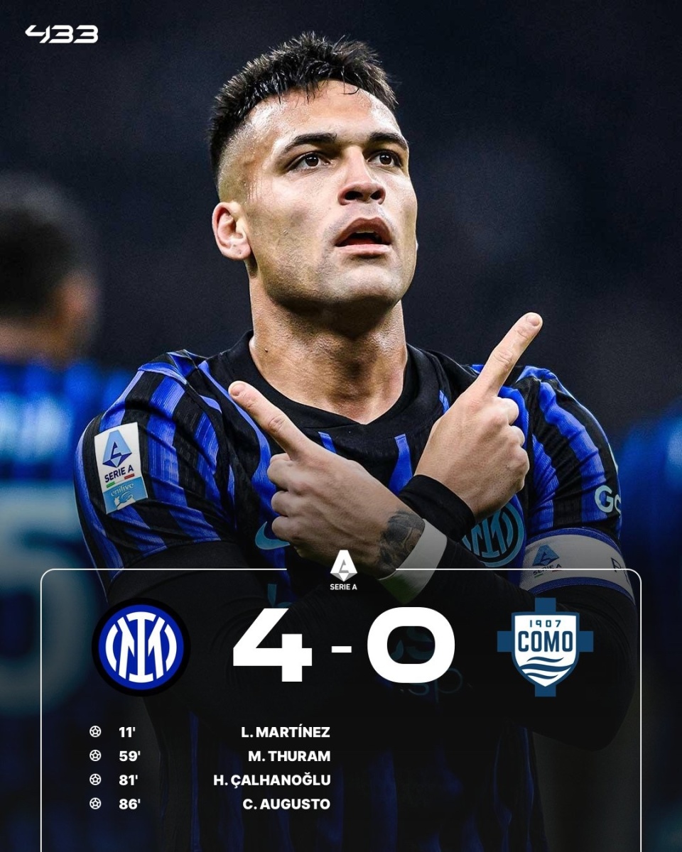 意甲第14轮,国米主场4-0科莫,先赛2分领跑。恩里克助攻劳塔罗闪击得手,小图拉姆破门扩大比分,恰尔汉奥卢远射再下一城,奥古斯托替补建功。