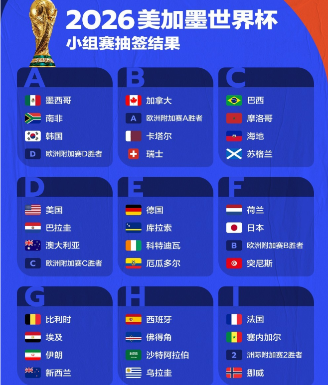 北京时间12月6日凌晨,2026美加墨世界杯抽签仪式在美国华盛顿正式进行,经过抽签之后结果目前已经全部出炉,东道主之一的墨西哥与南非将会在北京时间6月11日于墨西哥阿兹特克球场打响揭幕战。而法国、挪威与塞内加尔则是组成了本届世界杯的死亡之组。