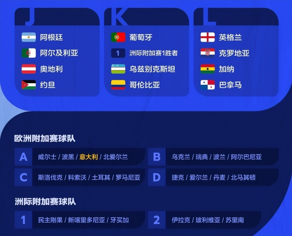 K组:葡萄牙、哥伦比亚、乌兹别克斯坦、洲际附加1胜者