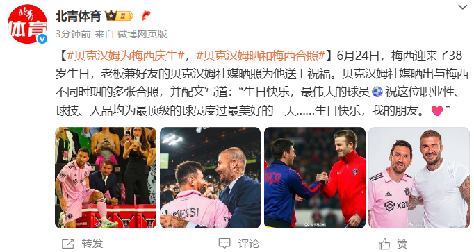 贝克汉姆社媒晒出与梅西不同时期的多张合照,并配文写道:“生日快乐,最伟大的球员,祝这位职业性、球技、人品均为最顶级的球员度过最美好的一天……生日快乐,我的朋友。”