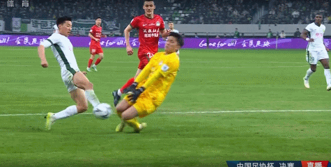 第一次是比赛进行到第31分钟,当时北京国安队进攻,皮球经过一次长传来到河南队禁区内,河南队守门员王国明面对来球及时出击将球封堵,但包抄的曹永竞在拿不到球,并且越位的情况已经,在没有碰到球的情况下,右脚踩在了王国明的脚上。