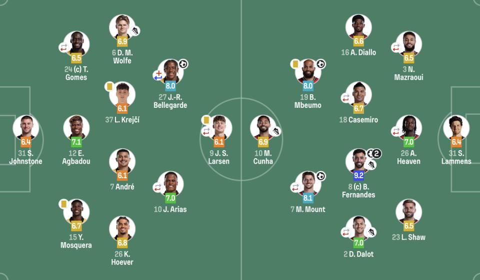 曼联(3421):31-拉门斯;3-马兹拉维(69’6-利马),26-海文(69’15-约罗),23-卢克肖;16-迪亚洛,18-卡塞米罗(78’37-梅努),8-B费,2-达洛特(85’13-多古);18-姆伯莫,7-芒特(85’11-齐尔克泽);10-库尼亚