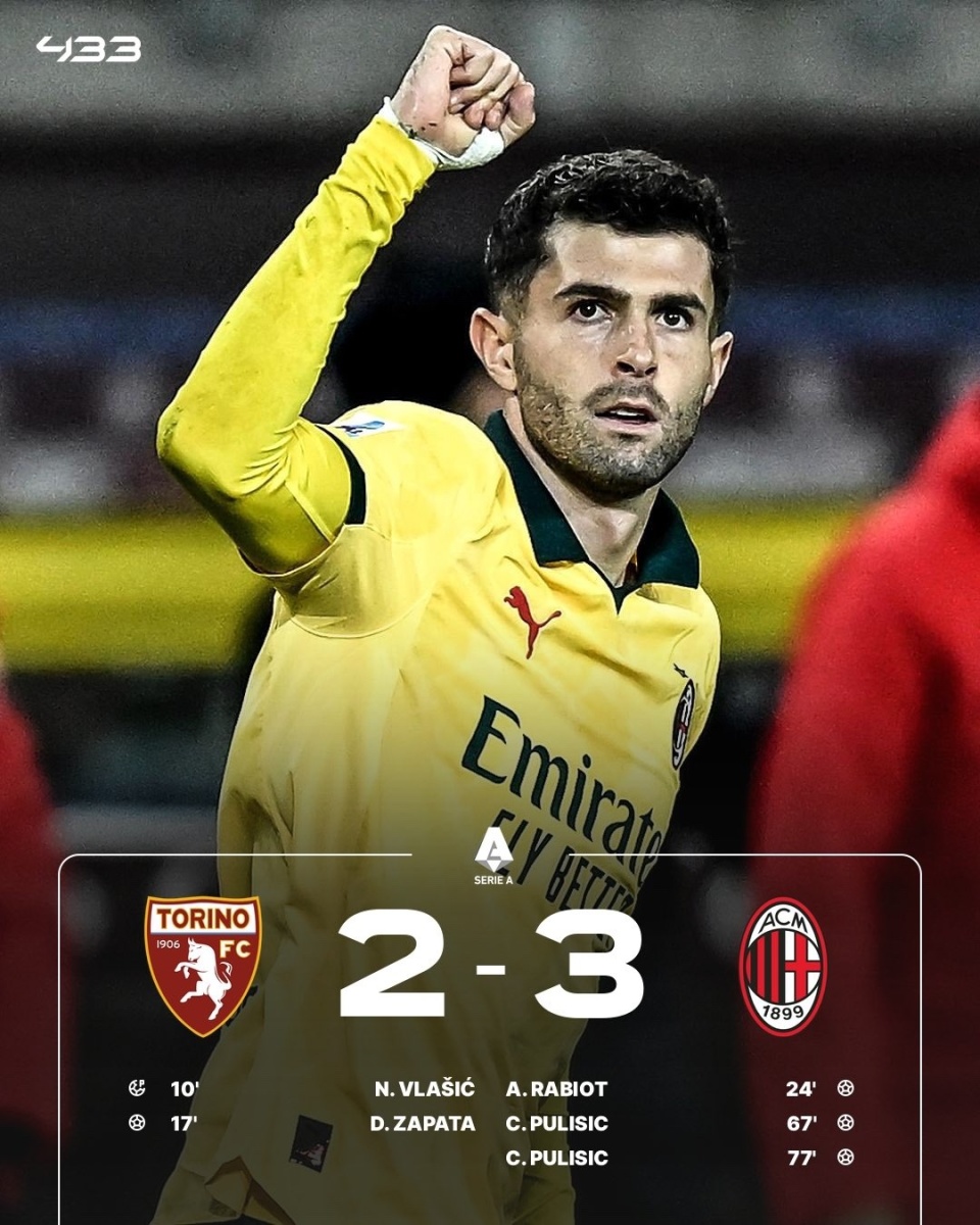 意甲第14轮,AC米兰3-2逆转都灵,31分登顶榜首。托莫里手球送点,弗拉西奇点射建功,萨帕塔反击再进一球,拉比奥超级世界波,莱奥伤退,普利西奇替补双响,再进一球被吹。【详情】
