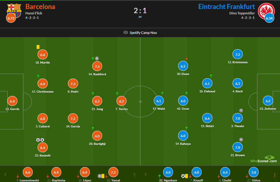 本场比赛巴塞罗那上半场表现不佳,让客场作战的法兰克福率先取得进球,不过下半场巴萨踢出了更加犀利的进攻,靠着孔德3分钟之内的梅开二度,2-1复仇法兰克福。