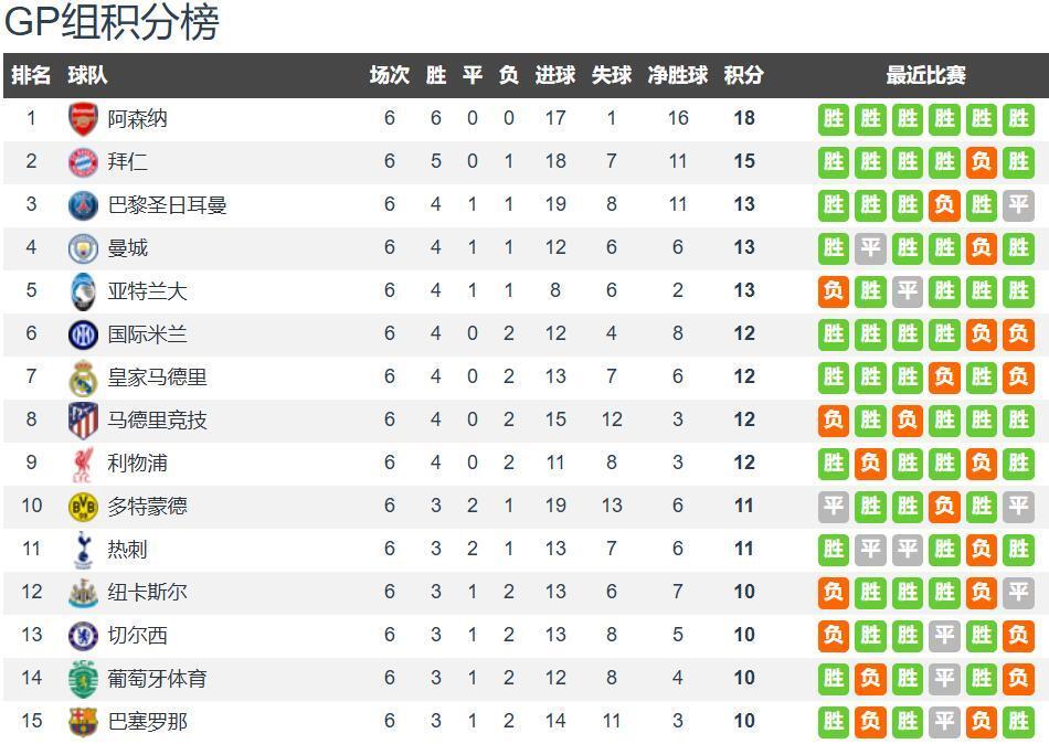 欧冠6轮战罢,阿森纳18分第一,拜仁15分第二,巴黎、曼城、亚特兰大都是13分排名第3-第5,国际米兰、皇马、马竞、利物浦都是12分排名第6-第9,欧冠联赛阶段前8直接晋级。多特蒙德和热刺都是11分,纽卡斯尔、切尔西、葡萄牙体育、巴萨都是10分,也是前8的竞争者。