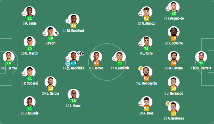 巴塞罗那(4-2-3-1):霍安-加西亚;孔德,库巴西(75'德容),赫拉德-马丁,巴尔德(88'克里斯滕森);埃里克-加西亚,佩德里(88'巴德吉);亚马尔,拉菲尼亚(88'卡萨多),拉什福德(75'费尔明);费兰-托雷斯