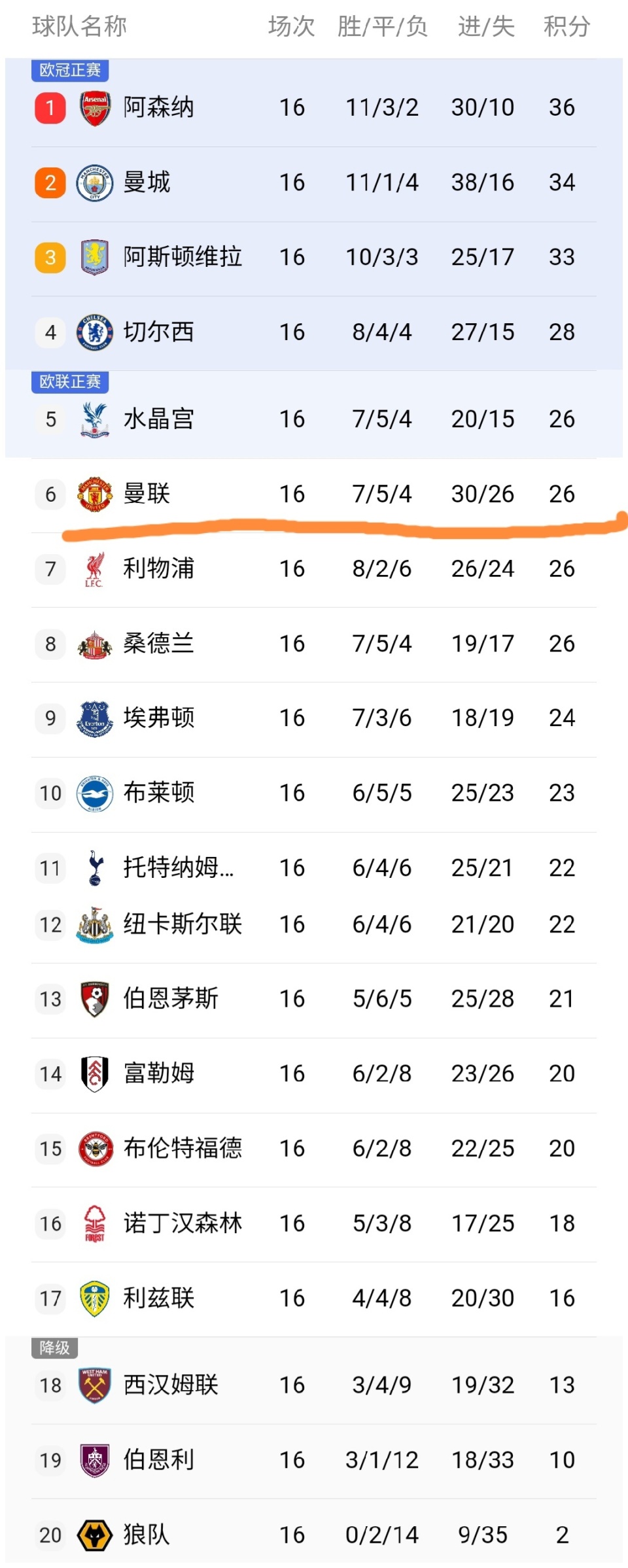 今天凌晨,英超第16轮结束了最后一场的较量,在这场比赛结束之后,英超所有球队都已经踢完了前16轮的比赛,英超积分榜也随之更新,我们来看看英超第16轮全部结束之后的积分排名情况。