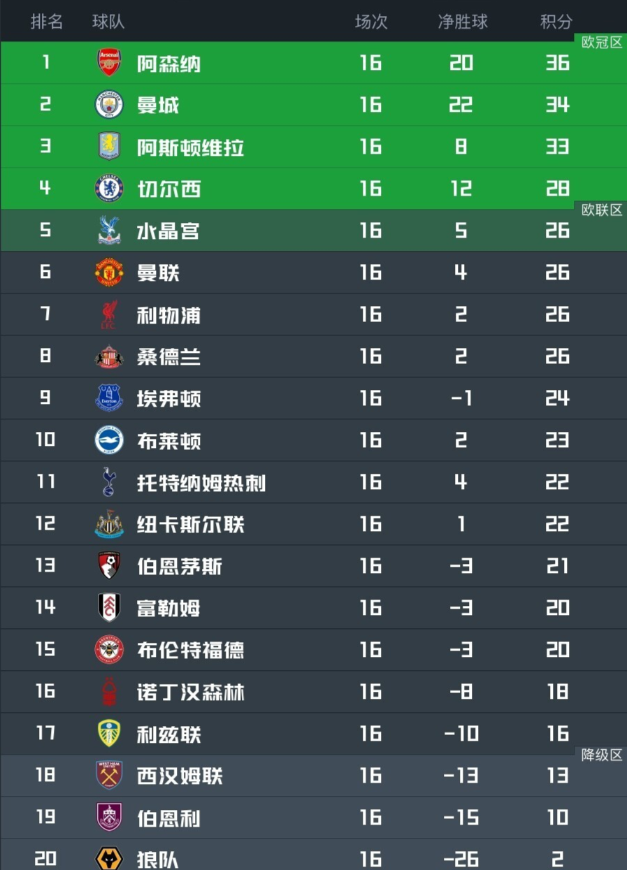 本轮战罢,领头羊阿森纳仍领跑。但身后的曼城和维拉给他们施加了巨大压力,在不断连胜后,两队距离阿森纳分别只有2分和3分。
