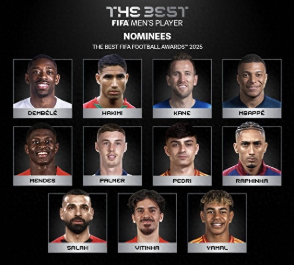 巴黎俱乐部有4人被FIFA列为候选人,分别是登贝莱、维蒂尼亚、阿什拉夫以及门德斯。另外巴萨的亚马尔、佩德里以及拉菲尼亚入选,皇马的姆巴佩,拜仁的凯恩,利物浦的萨拉赫以及切尔西的帕尔默也在其中。在这些候选人中,没有球员曾经得过奖,也就是说,无论谁夺魁都将改写历史。梅西共8次得奖,为FIFA年度最佳球员获奖次数最多的球员,去年该奖项的获得者是维尼修斯。