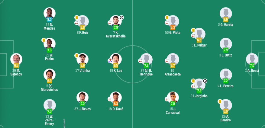 巴黎圣日耳曼出场阵容:39-萨福诺夫、25-努诺·门德斯、51-帕乔、5-马尔基尼奥斯、33-扎伊尔·埃梅里、8-法比安(106’47-恩贾恩图)、17-维蒂尼亚、87-若昂-内维斯、7-克瓦拉茨赫利亚(91’49-姆巴耶)、14-杜埃(79’10-登贝莱)、19-李刚仁(34’24-马尤卢(64’29-巴尔科拉))