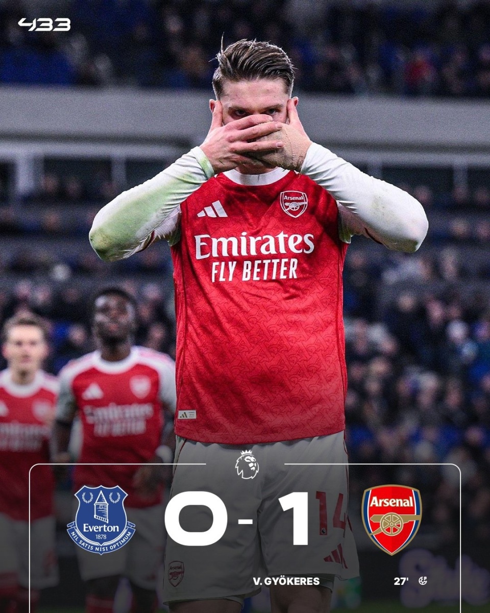 阿森纳客场1-0小胜埃弗顿,以2分优势领跑积分榜,夺得圣诞冠军。奥布莱恩手球送点,哲凯赖什点射建功,特罗萨德、苏维门迪先后中柱。