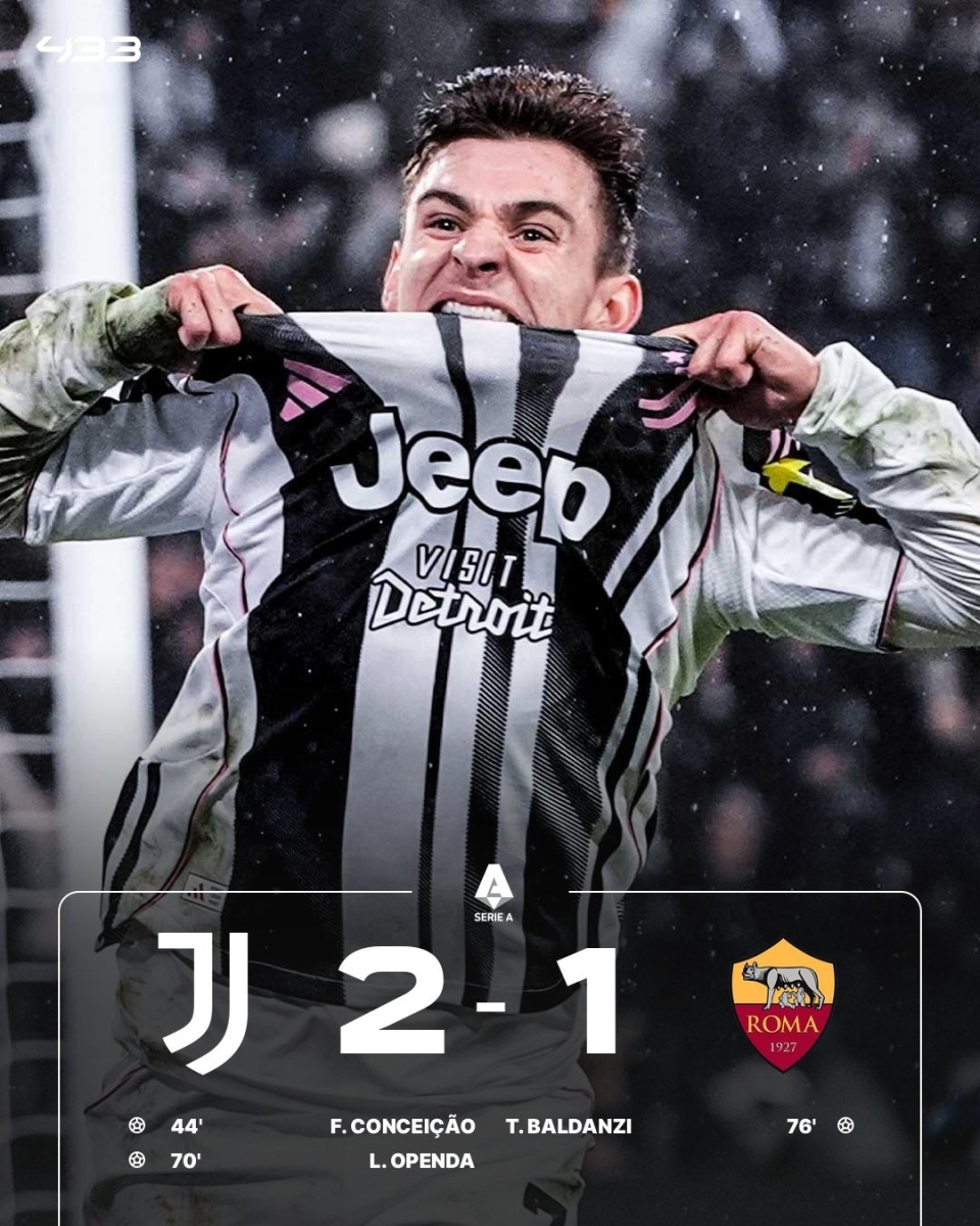 意甲第16轮,尤文主场2-1战胜罗马,取得各赛事3连胜,仍居第5。小孔塞桑打破僵局,坎比亚索脚后跟助攻,奥蓬达意甲首球,麦肯尼助攻,巴尔丹齐扳回一城。