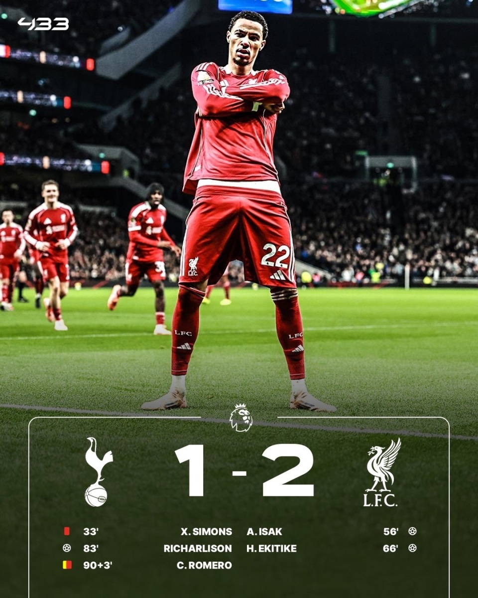 英超第17轮,利物浦客场2-1九人热刺,各项赛事三连胜。哈维-西蒙斯蹬踏范戴克,被直红罚下,伊萨克接维尔茨助攻破门后伤退,埃基蒂克再下一城,里沙利松扳回一球,罗梅罗补时阶段两黄变一红被罚下。